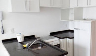 Cozinha com armários, fogão 04 bocas, 01 geladeira.
