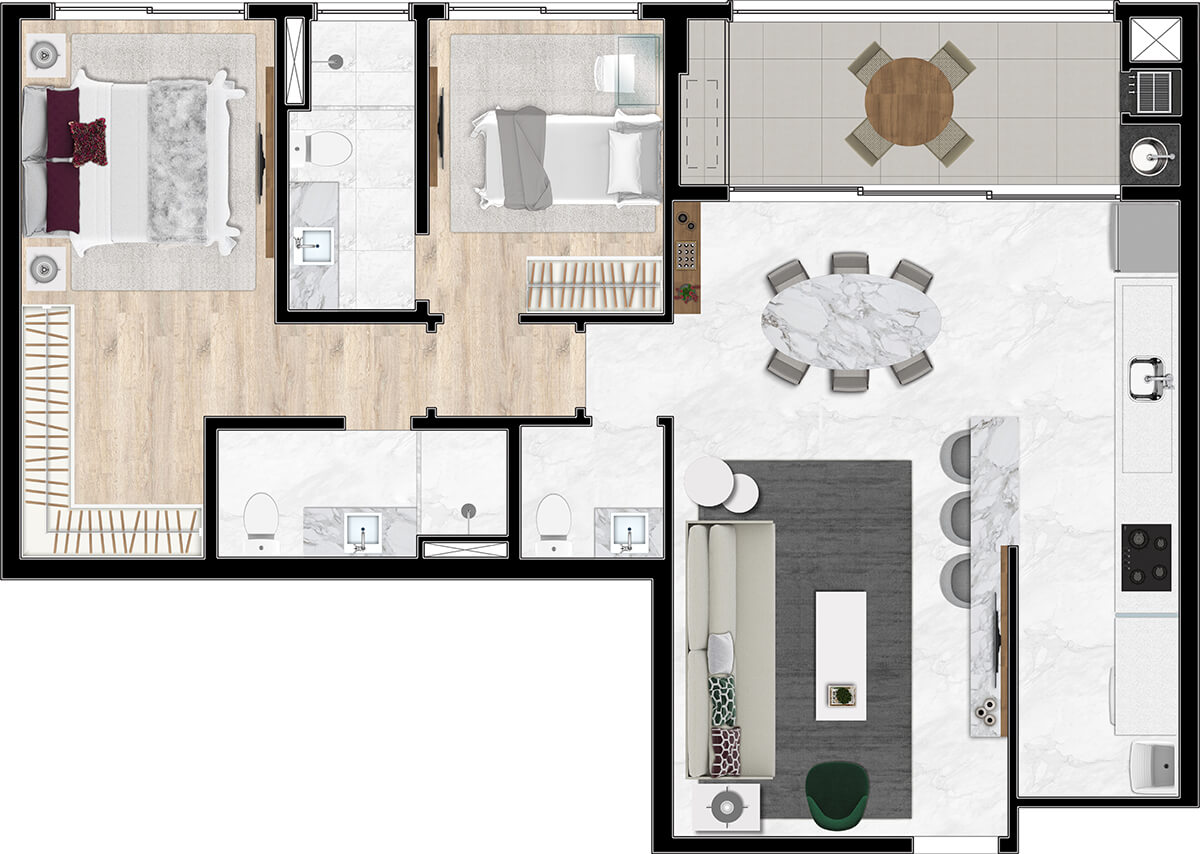 • Piso nivelado entre a varanda e a sala